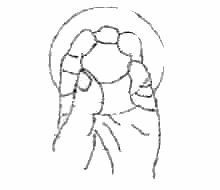 Unlike the previous grip, here the tool handle is held by the tips of the thumb, index and middle fingers, parallel to the work surface rather than at an angle to it. The hand is steadied by the little finger edge of the hand and perhaps knuckles resting or moving on the work surface, or against the other hand. There is a smaller range of movement (protraction and retraction) in using the tool because of its angle, its butt hitting the palm and the middle finger not being free to flex and extend. A similar grip may be used in delicate wood-carving.