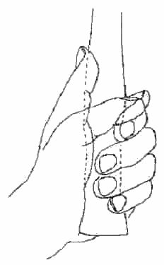 The fingers are bunched firmly around an object and overlapped by the thumb. The handle is thick enough to separate the finger-tips from the palm. In this situation the forearm muscles have shortened half-way through their available range of contraction, and they are at their most efficient, because of the mechanics of the line of pull.